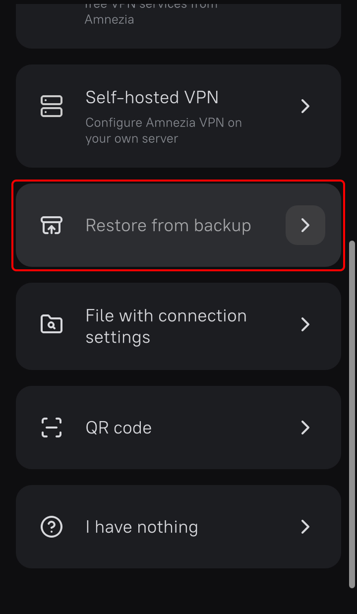 Führen Sie die AmneziaVPN-App aus, tippen Sie auf die Schaltfläche Los geht's , tippen Sie dann auf die Schaltfläche Aus Backup wiederherstellen und wählen Sie die heruntergeladene Trust.Zone_Amnezia_WireGuard.backup-Datei aus.