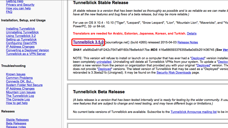 Laden Sie die lastabile Testversion von Tunnelblick herunter. Die Version auf dem Screenshot kann unterschiedlich sein.