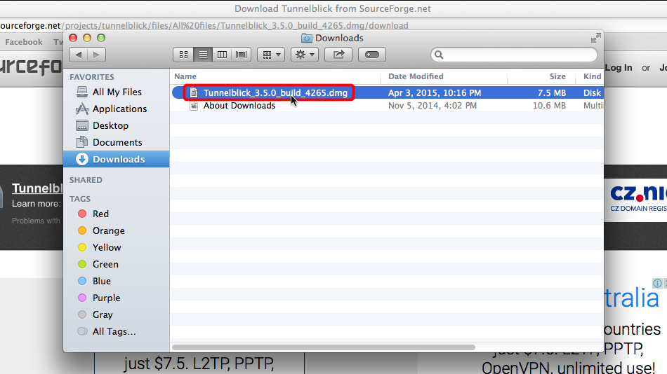 Navigieren Sie im Finder zu "Downloads" und doppelklicken Sie auf die heruntergeladene Tunnelblick-DMG-Datei.