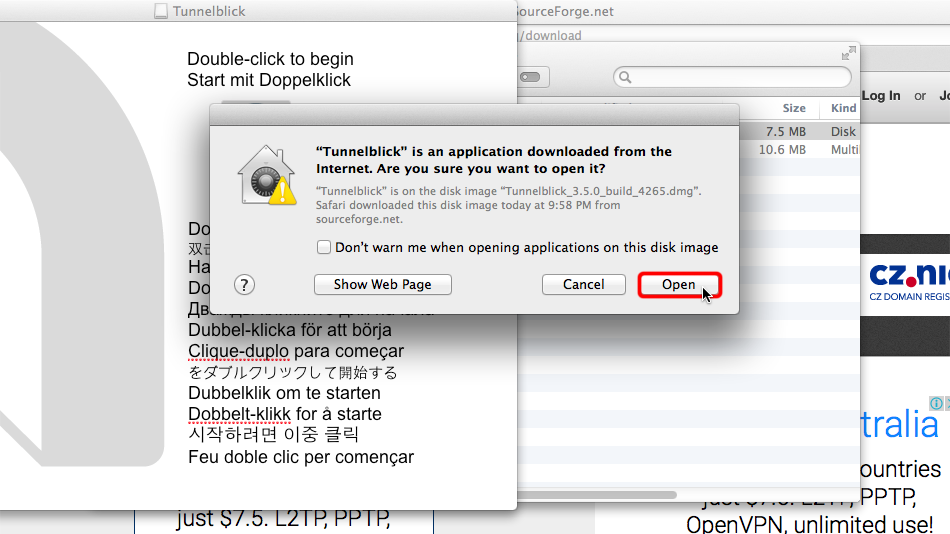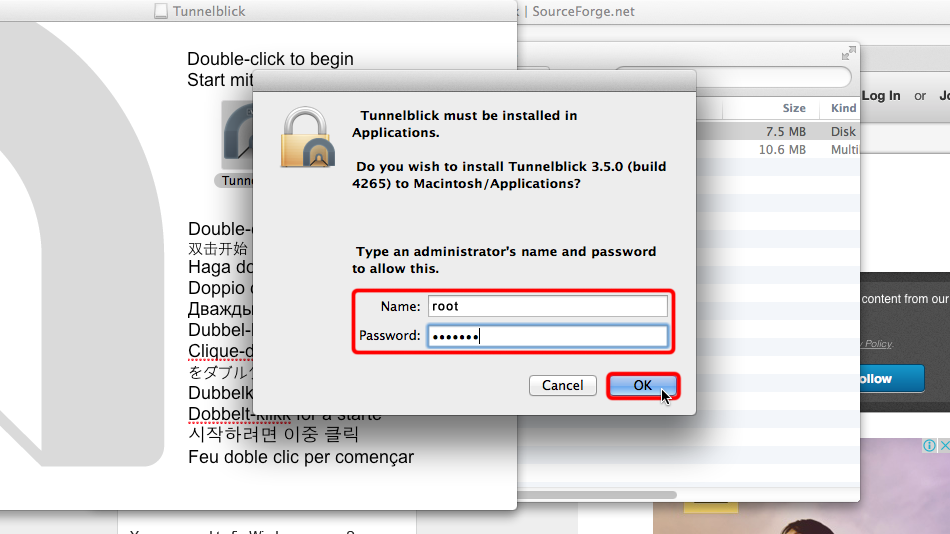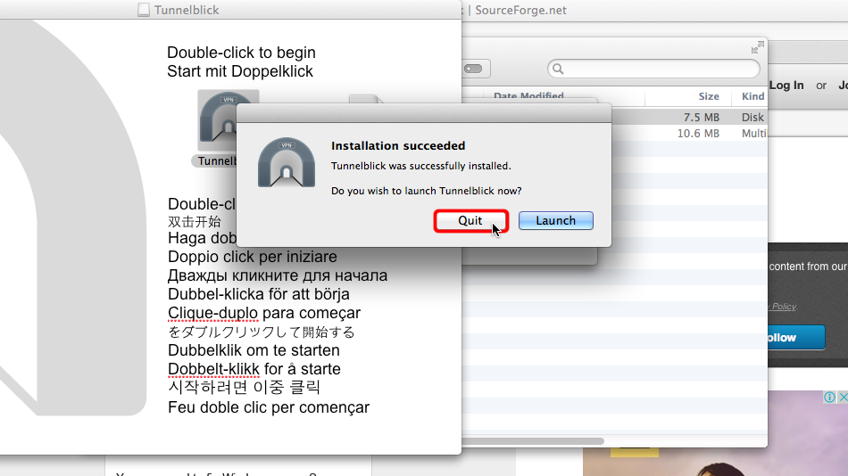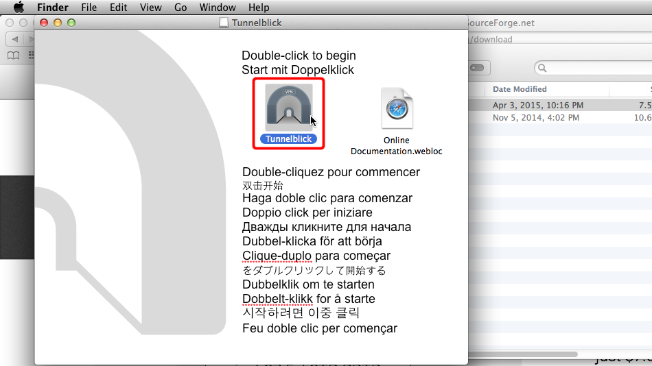 Wenn das Tunnelblick-Installationsprogramm geöffnet wird, doppelklicken Sie auf das Tunnelblick-Symbol, um mit der Installation zu beginnen.