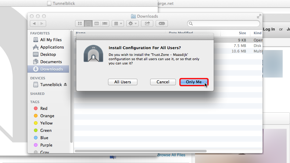 Laden Sie die .ovpn-Datei herunter. Navigieren Sie im Finder zu "Downloads" und doppelklicken Sie auf die ovpn-Datei.