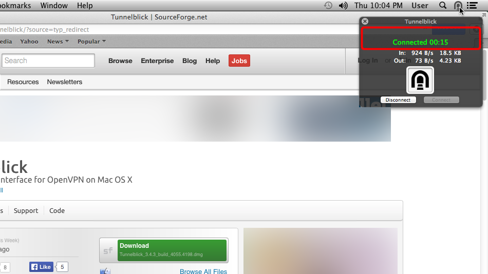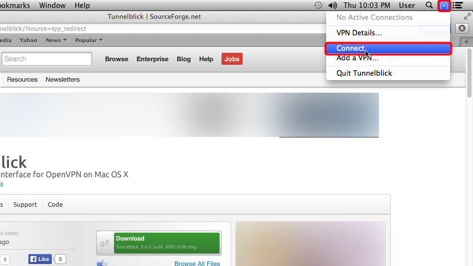 Klicken Sie auf das Tunnelblick-Symbol und wählen Sie Ihre VPN-Verbindung aus.