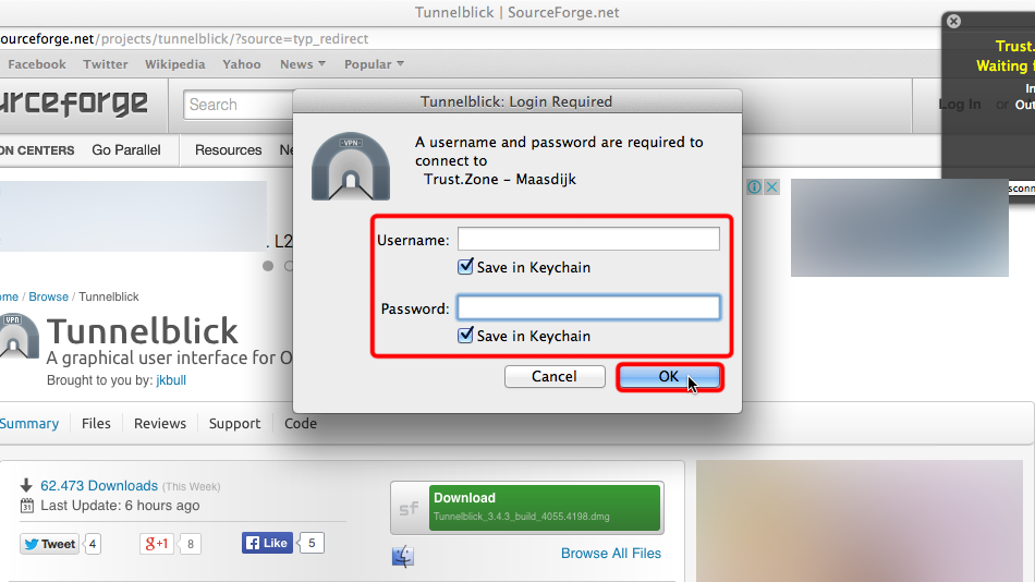 Aktivieren Sie "Im Schlüsselbund speichern", wenn Sie den VPN-Benutzer und/oder das VPN-Passwort nicht jedes Mal eingeben möchten, wenn Sie eine Verbindung zu Trust.Zone herstellen möchten.