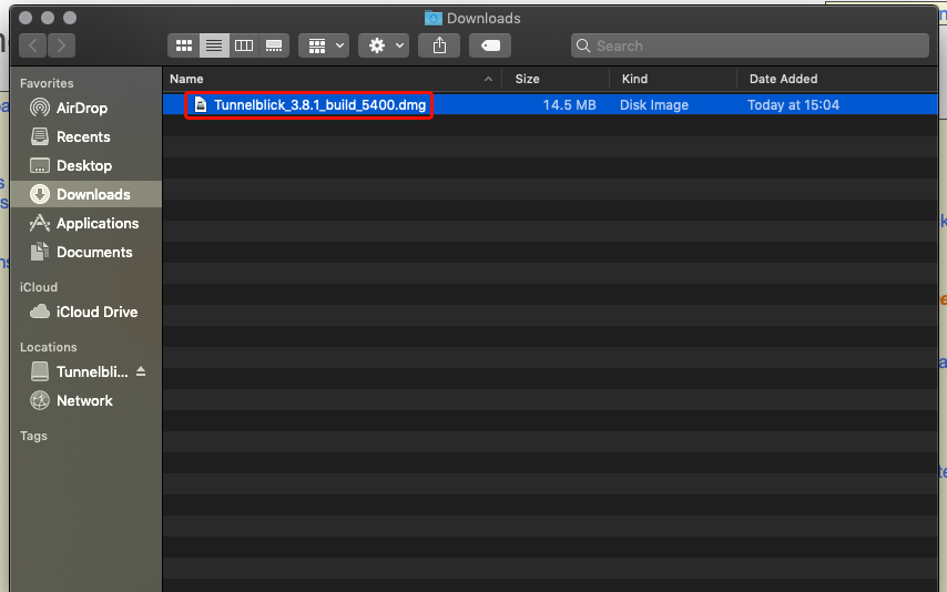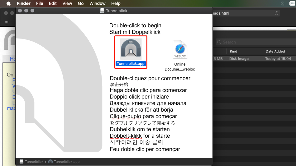 Navigieren Sie im Finder zu "Downloads" und doppelklicken Sie auf die heruntergeladene Tunnelblick-DMG-Datei.