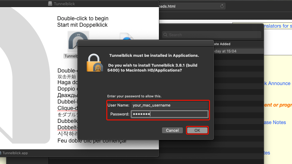 Geben Sie den Benutzernamen und das Passwort Ihres Macs ein und klicken Sie auf "OK", um die Installation zu bestätigen.