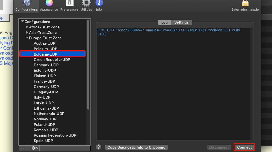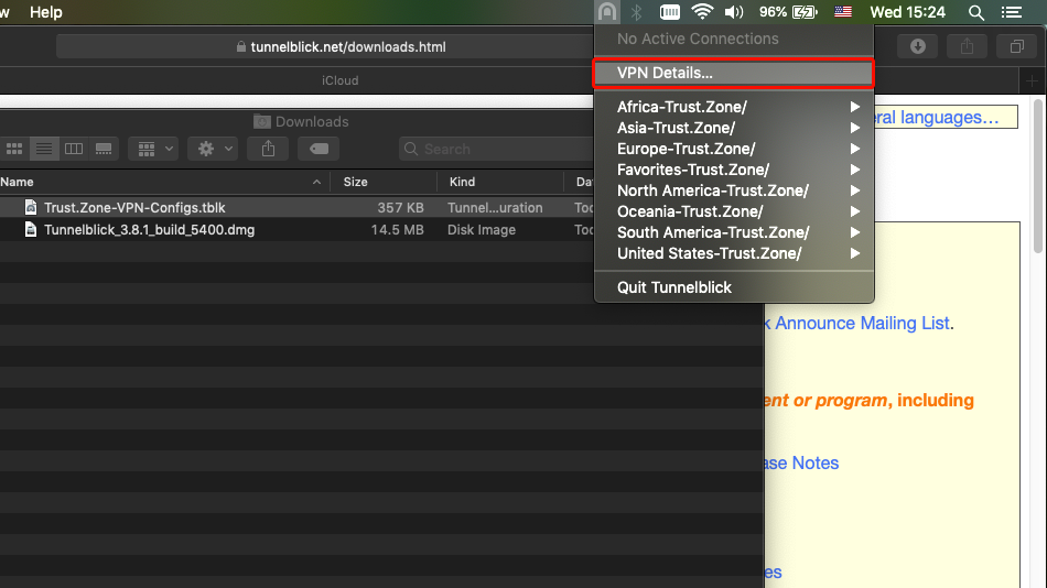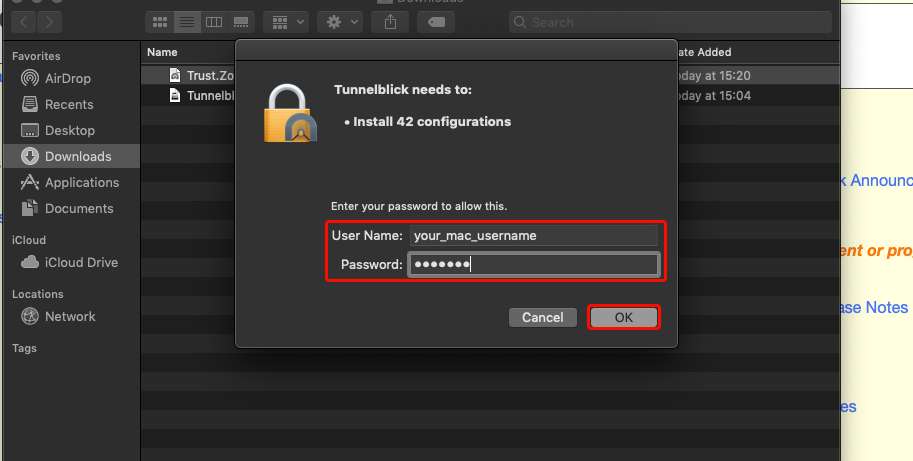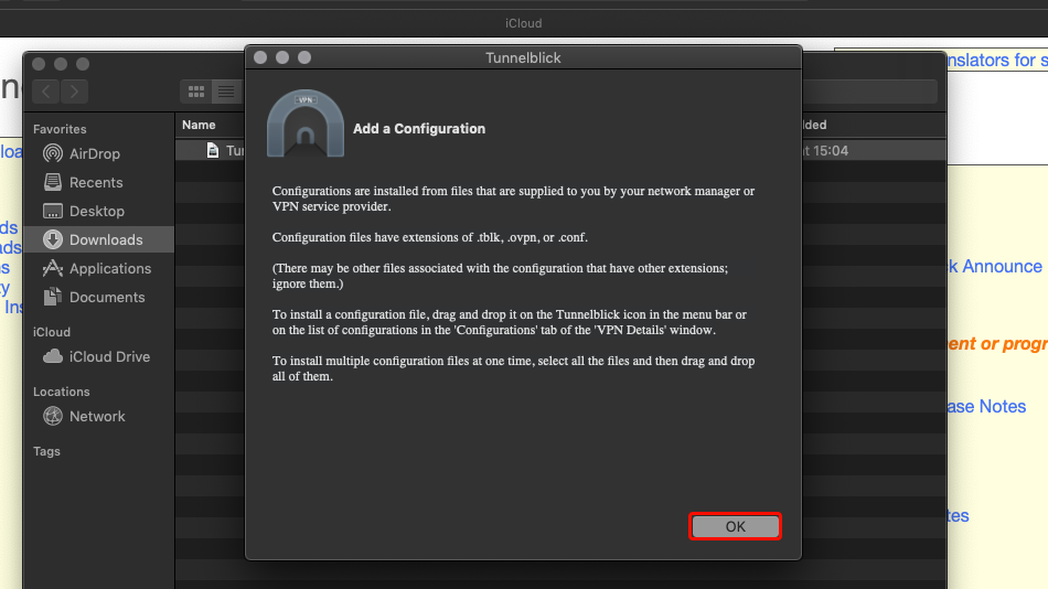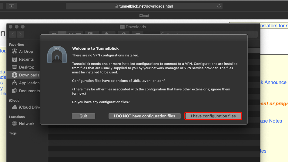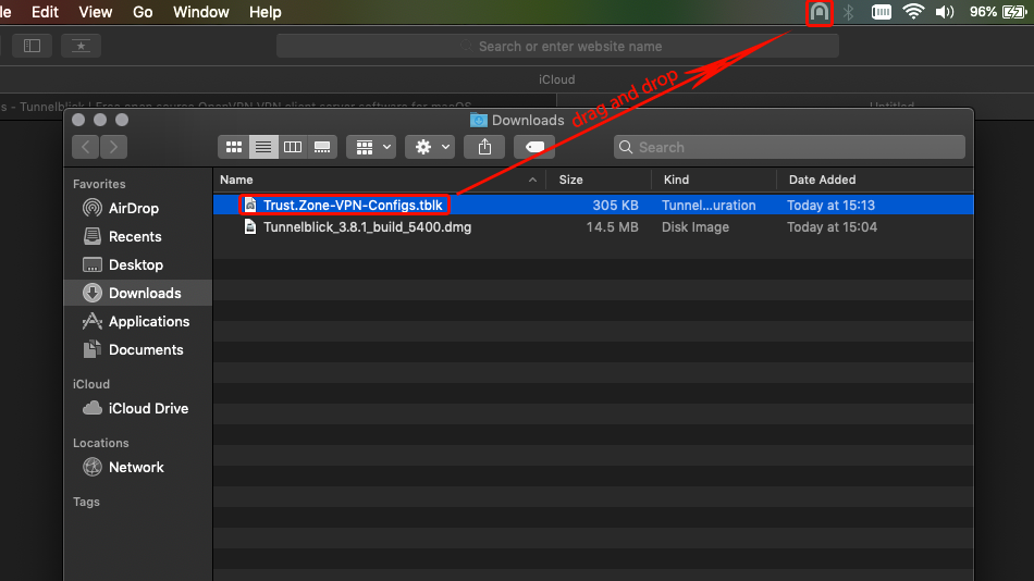 Laden Sie die Datei Trust.Zone-VPN-Configs.tblk herunter. Navigieren Sie im Finder zu "Downloads" und ziehen Sie Trust.Zone-VPN-Configs.tblk per Drag & Drop auf das Tunnelblick-Symbol.