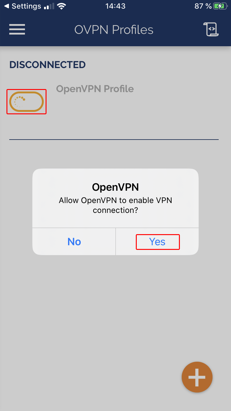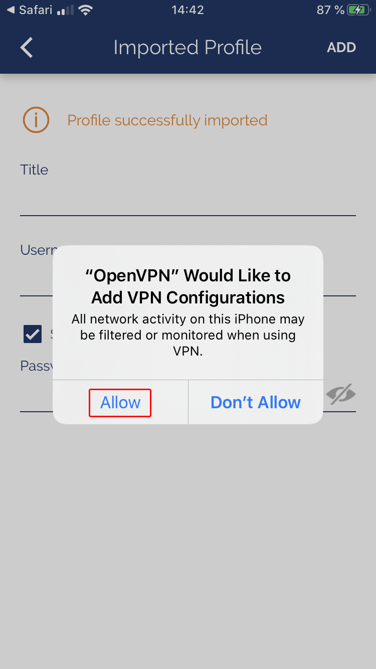 Toque Permitir para permitir que la aplicación OpenVPN Connect agregue la configuración de VPN en iOS.