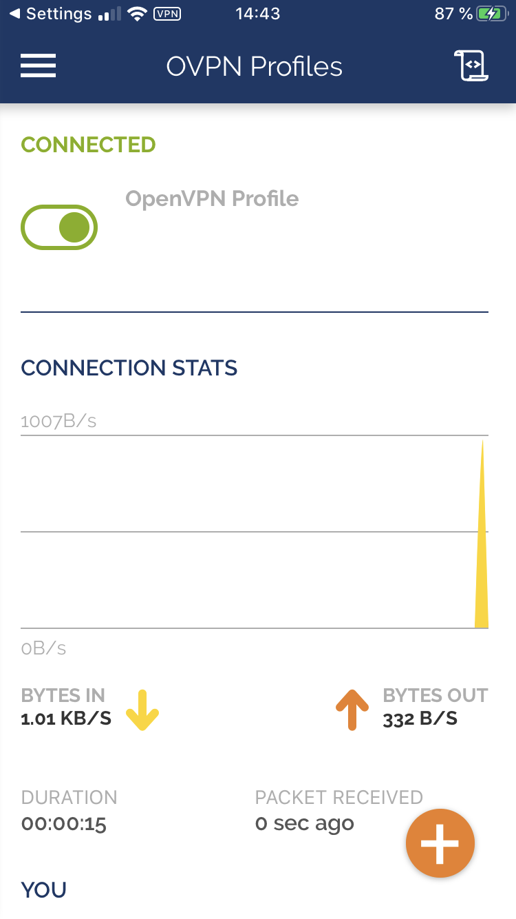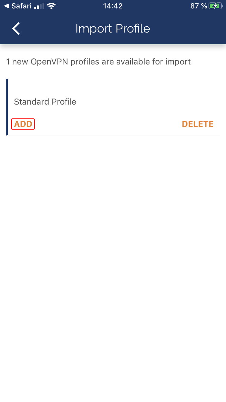 Toque el botón AGREGAR para agregar una conexión a la aplicación OpenVPN Connect .