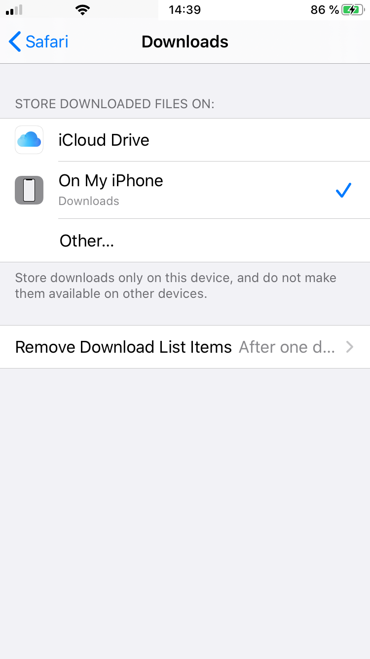 Ejecute Configuración desde la pantalla principal, vaya a Safari y cambie la configuración de Descargas al valor En mi iPhone.