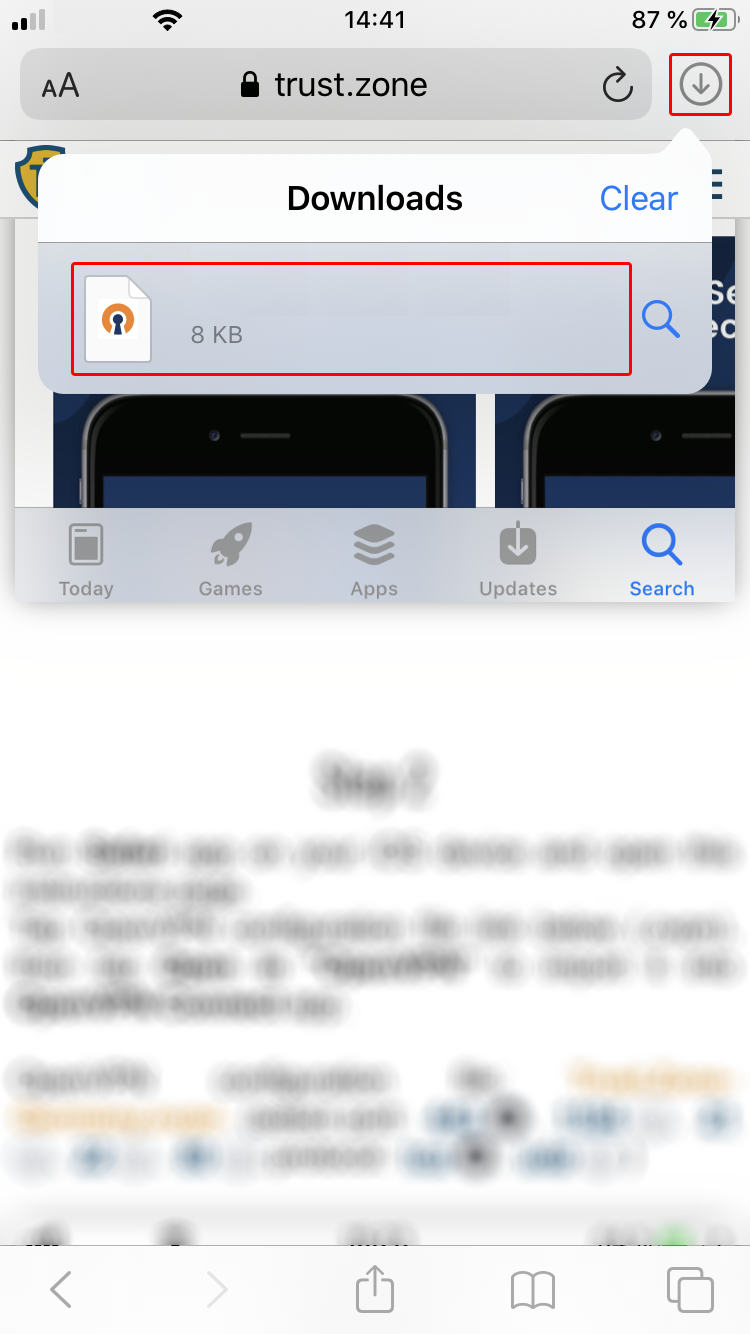 Toque el enlace del archivo de configuración de OpenVPN a continuación (.ovpn), luego toque Descargar para comenzar a descargar.