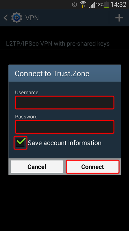Mettez votre nom d’utilisateur et votre mot de passe et cochez « Enregistrer les informations de compte » si vous souhaitez qu’Android se souvienne de vos identifiants de connexion. Appuyez ensuite sur « Connecter ».