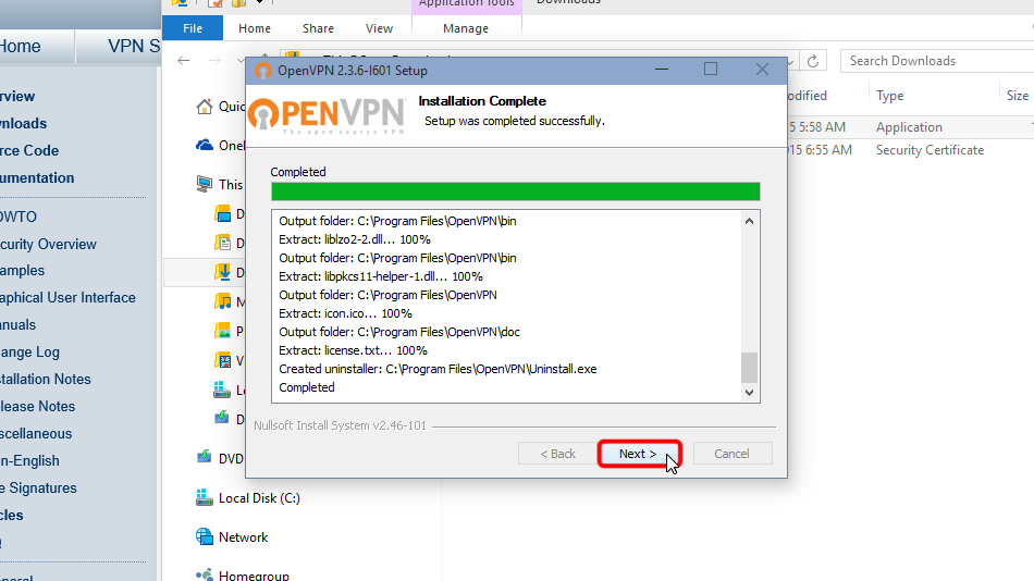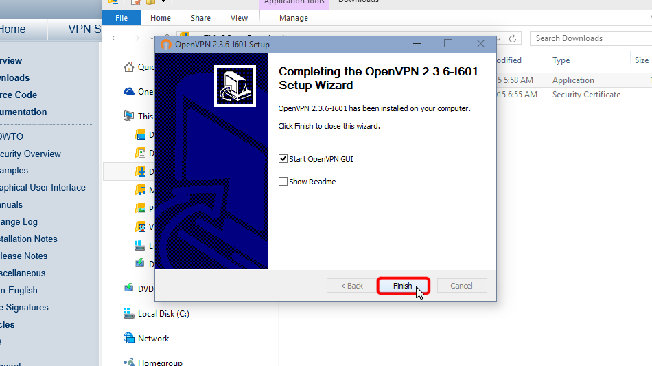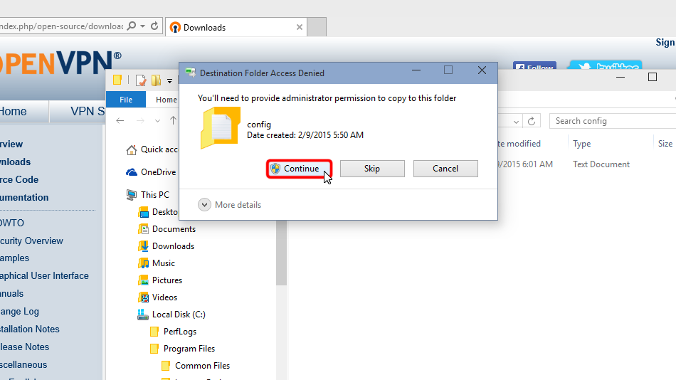 Copiez les fichiers téléchargés dans le dossier de configuration d’OpenVPN (par défaut C :/Program Files/OpenVPN/config/) et confirmez les messages de sécurité Windows.