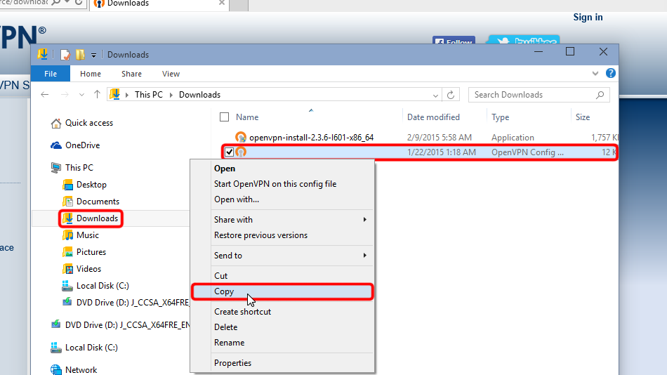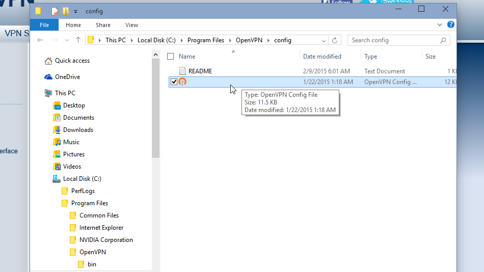 Navigate to your OpenVPN "config" folder, by-defalut this is "C:Program FilesOpenVPNconfig" and paste config file(s) there: right click on free space in folder then click "Paste".
