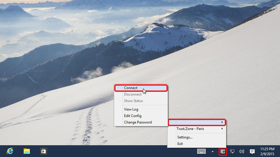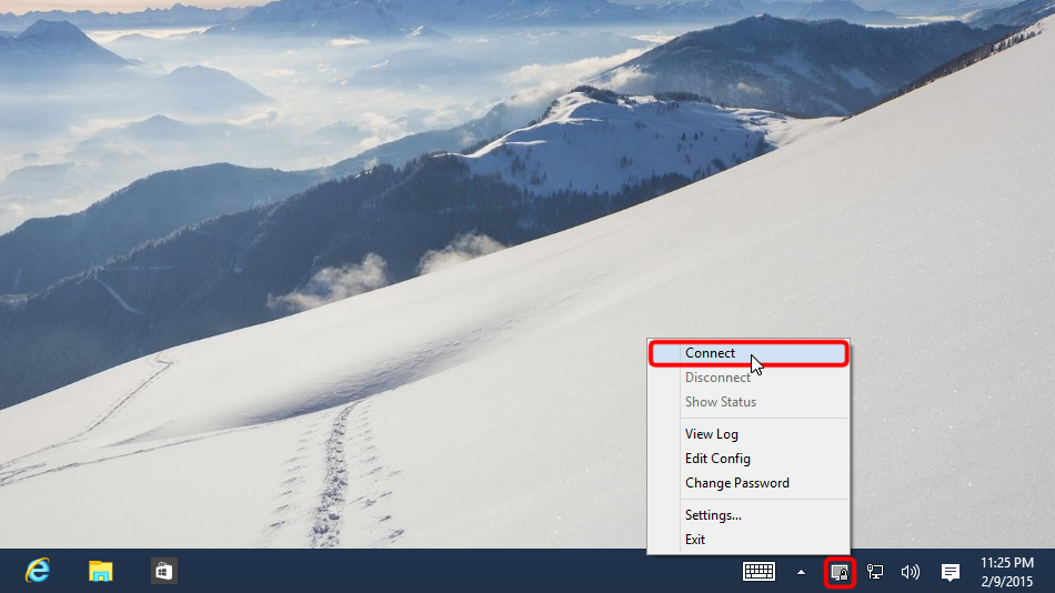 En cas de configuration d’une connexion unique. Faites un clic droit sur l’icône de la barre d’état OpenVPN et cliquez sur « Connecter ».