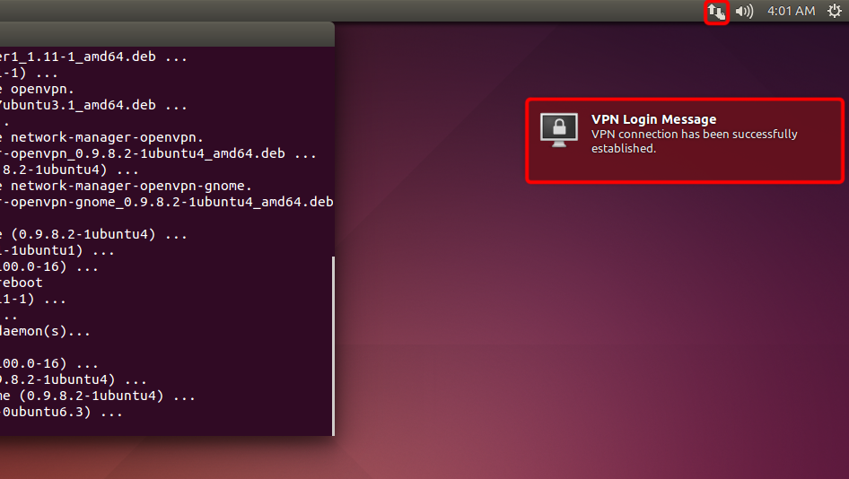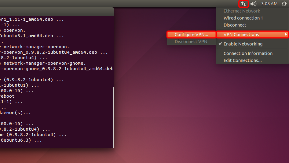 Cliquez sur l’icône du menu réseau, choisissez « Connexions VPN » et cliquez sur le nom de votre connexion créée pour établir une connexion VPN.