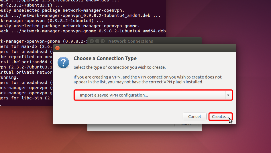 Cliquez sur « Importer une configuration VPN enregistrée... » et cliquez sur « Créer »