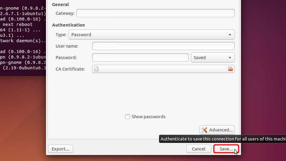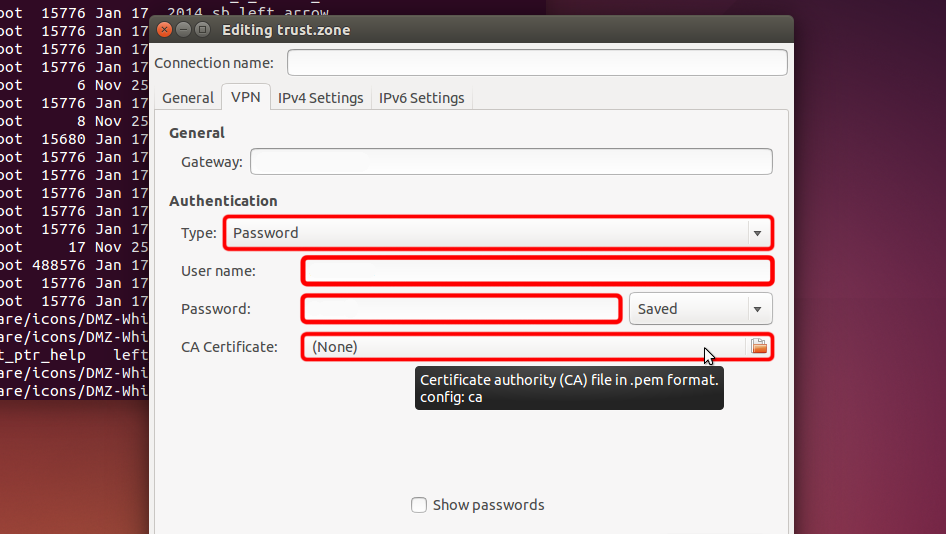 Sélectionnez « Mot de passe » dans le menu déroulant « Type », entrez votre nom d’utilisateur et votre mot de passe VPN.