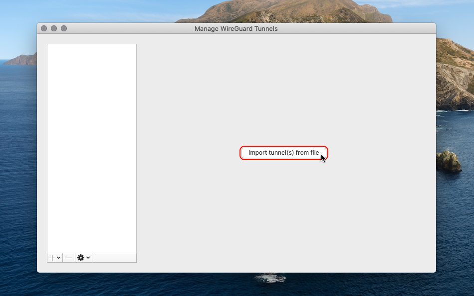 Passez à l’application cliente WireGuard et cliquez sur le bouton Importer un ou plusieurs tunnels à partir d’un fichier (ou appuyez sur Commande-O sur votre clavier au cas où vous ne verriez pas ce bouton) pour ouvrir la boîte de dialogue d’importation.