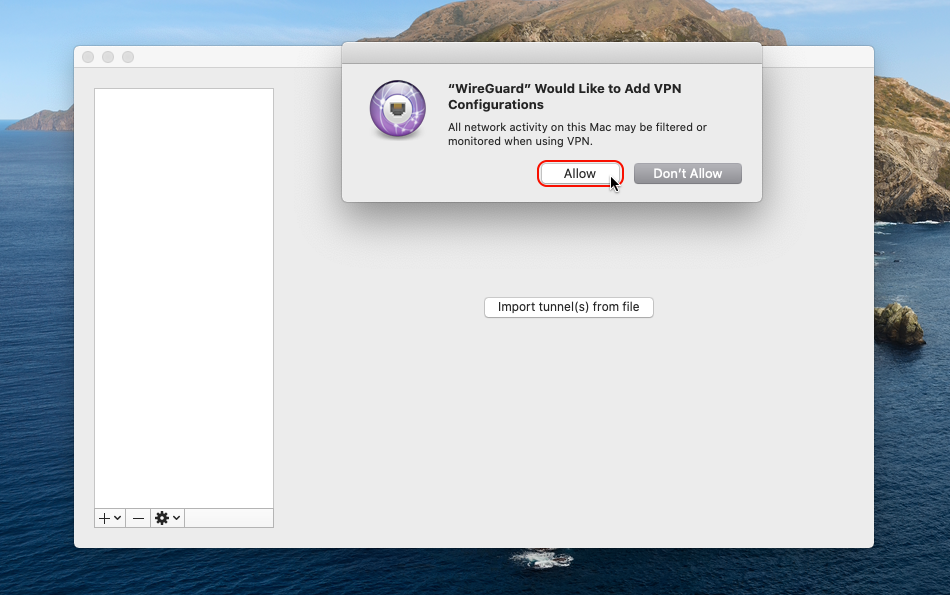Veuillez cliquer sur le bouton Autoriser dans la boîte de dialogue « WireGuard » Souhaiter ajouter une configuration VPN .