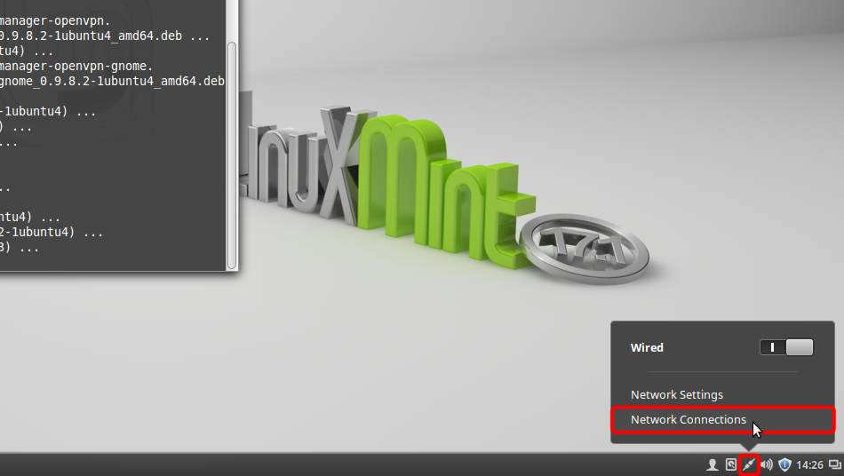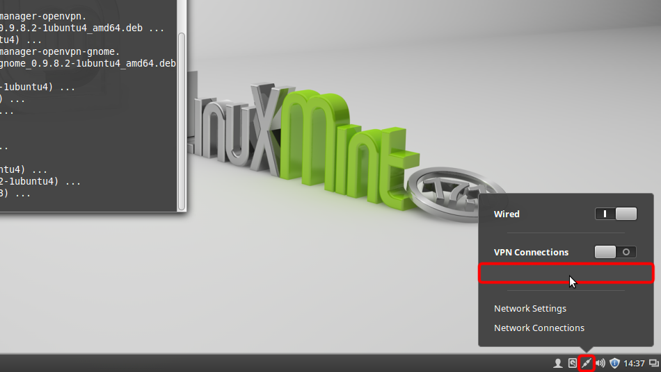 Click network menu icon, choose "VPN Connections" and click on your created connection name to establish a VPN connection.