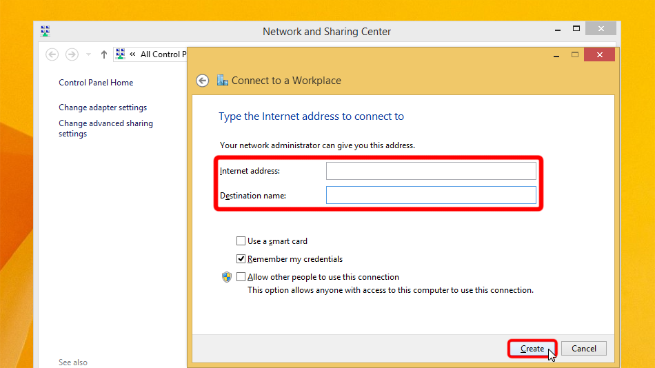 Fill form with values shown below. Check "Remember my credentials" and click on "Create".