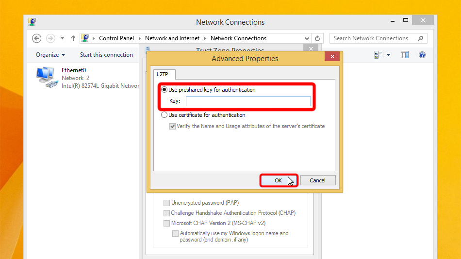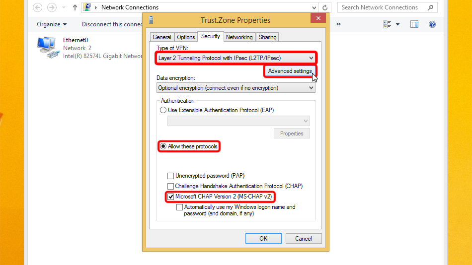 Switch to the tab "Security", select Type of VPN "Layer 2 Tunneling Protocol with IPsec (L2TP/IPsec)" and take over the settings from the screenshot. Then click on "Advanced settings".