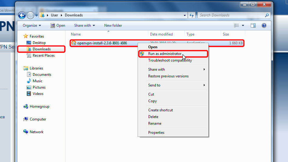 Open file explorer and navigate to directory where you downloaded OpenVPN Client installation file. By default this is "Downloads" directory. Select installation file with left click then right click on it and left click "Run as administrator".