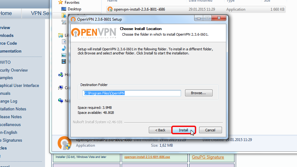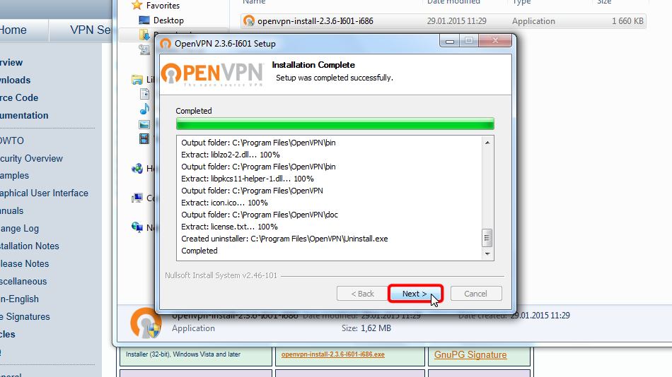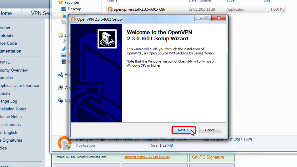 Copy downloaded files to the OpenVPN configuration folder (by default C:/Program Files/OpenVPN/config/) and confirm the Windows security messages.