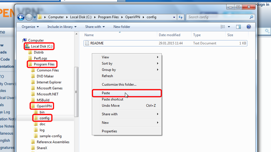 Navigate to your OpenVPN "config" folder, by-defalut this is "C:Program FilesOpenVPNconfig" and paste config file(s) there: right click on free space in folder then click "Paste".
