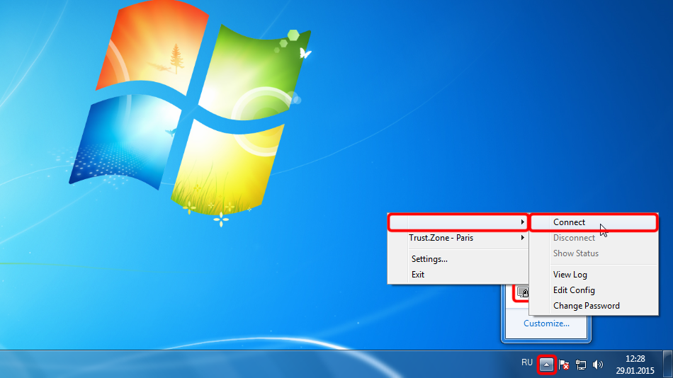 In case you have multiple connections configured. Right click OpenVPN tray icon, select location you want to connect and click "Connect".