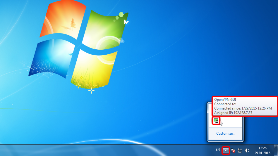 Once the connection has been successfully established, the OpenVPN icon turns green. You can manage your VPN connection with OpenVPN.
