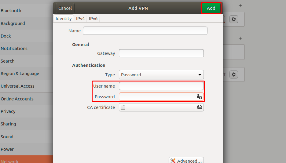Select "Password" from "Type" drop-down menu, enter your VPN username and password.