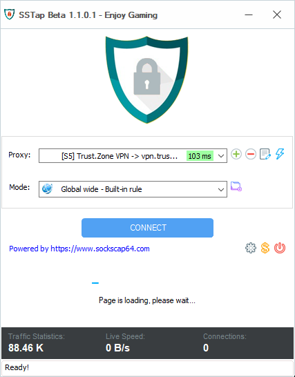 После подключения приложение свернётся в иконку в системном трее, кликнув по которой можно открыть окно SSTap-beta.