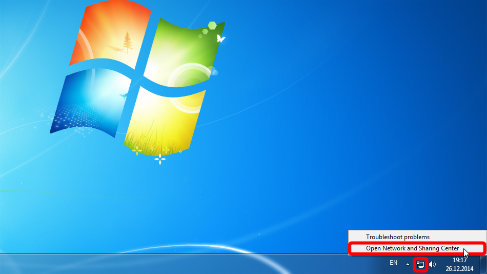 Right click on the network icon in the system tray and then click "Open Network and Sharing Center".