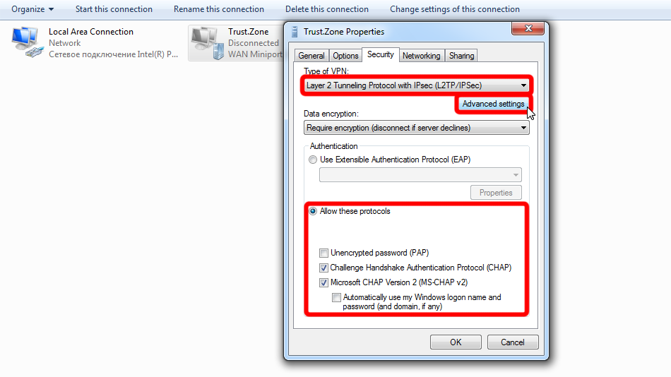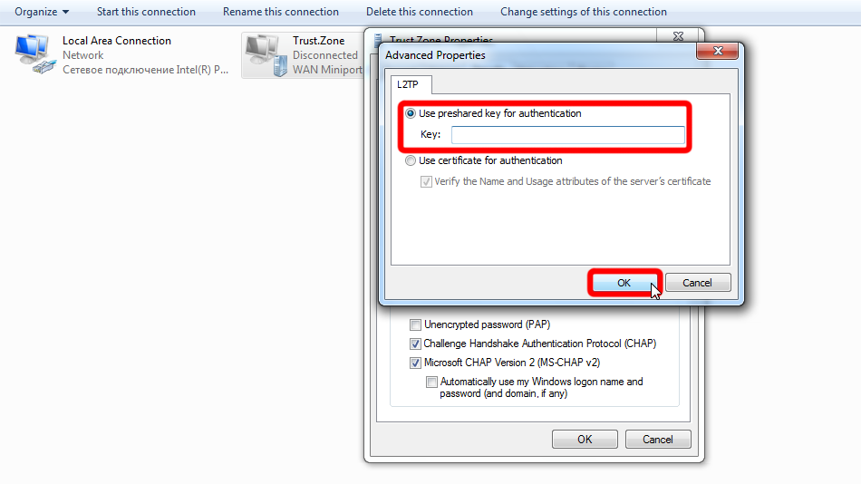 Choose "Use preshared key...", the key is: trustzone and click "OK". Then click "OK" again in order to close connection properties.