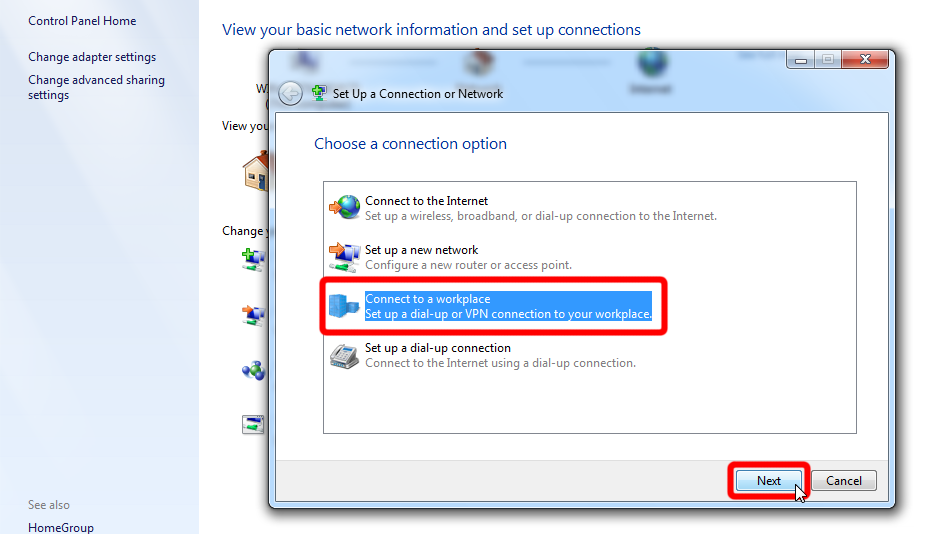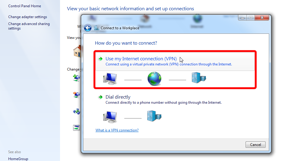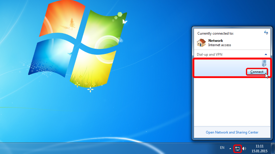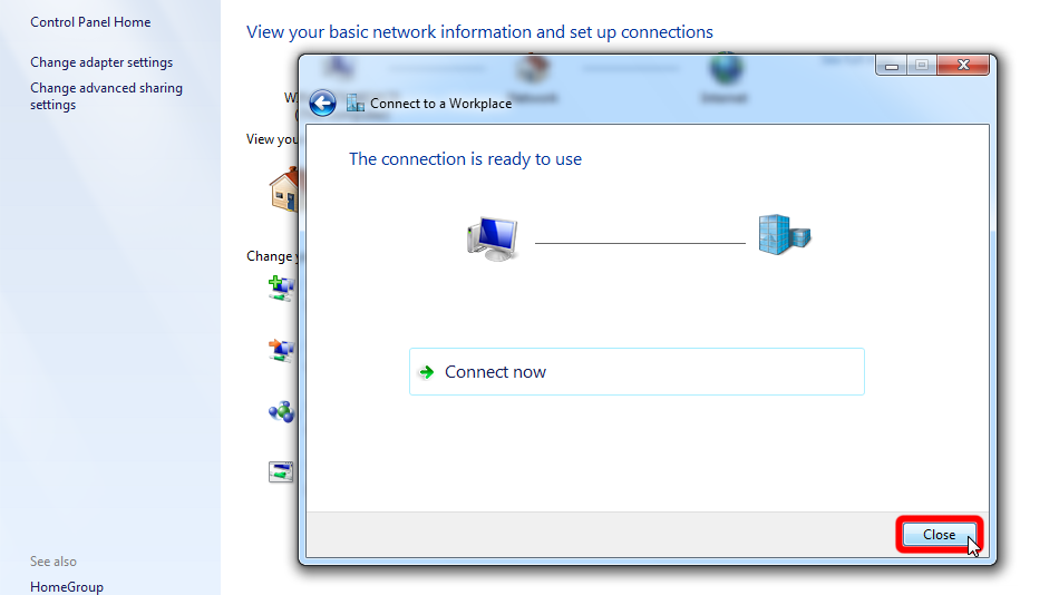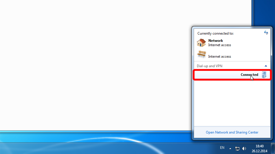 If connection has been successfully established, it displays "Connected". You can manage your VPN connections in the "Network and Sharing Center" > "Change adapter settings".