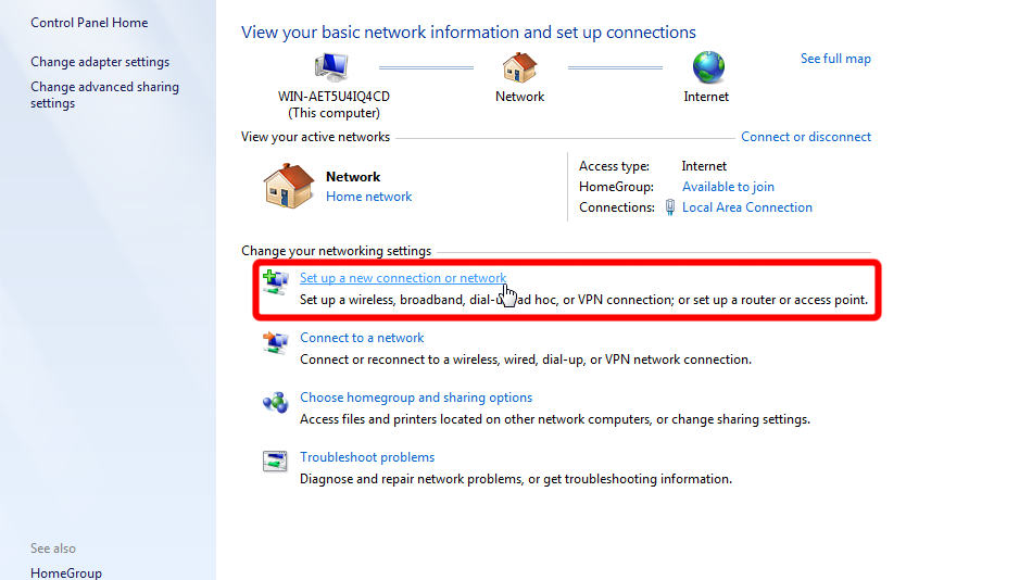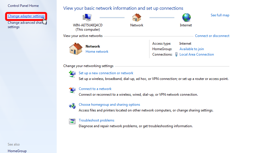 Click "Change adapter settings" in left pane of "Network and Sharing center".