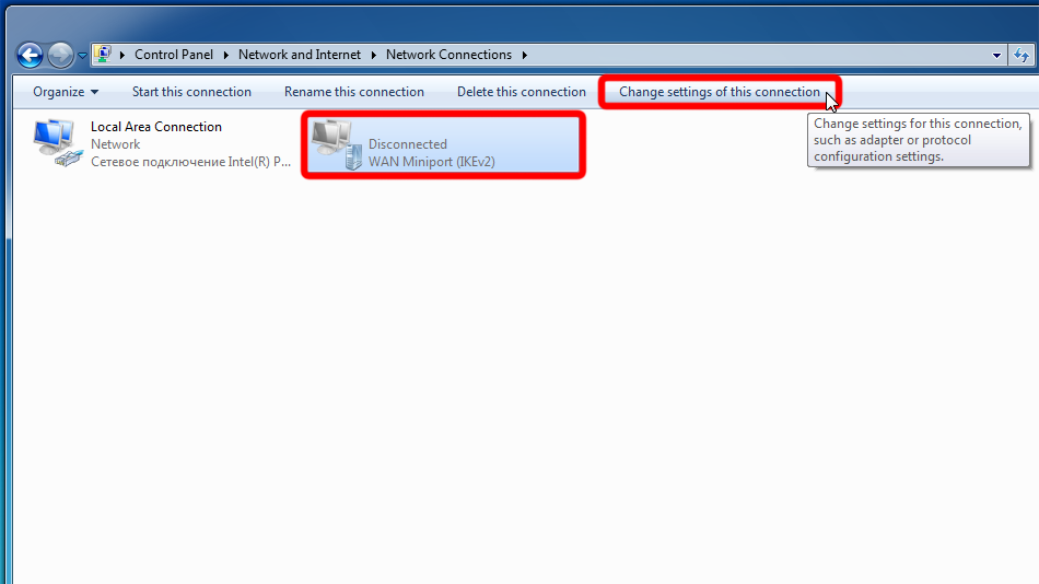 Left click the VPN network adapter and then click "Change settings of this connection".