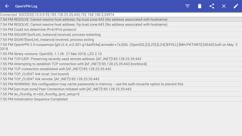 OpenVPN Günlüğünde Tamamlanan Mesaj Başlatma Sırası , Trust.Zone VPN'e başarıyla bağlandığınız anlamına gelir.