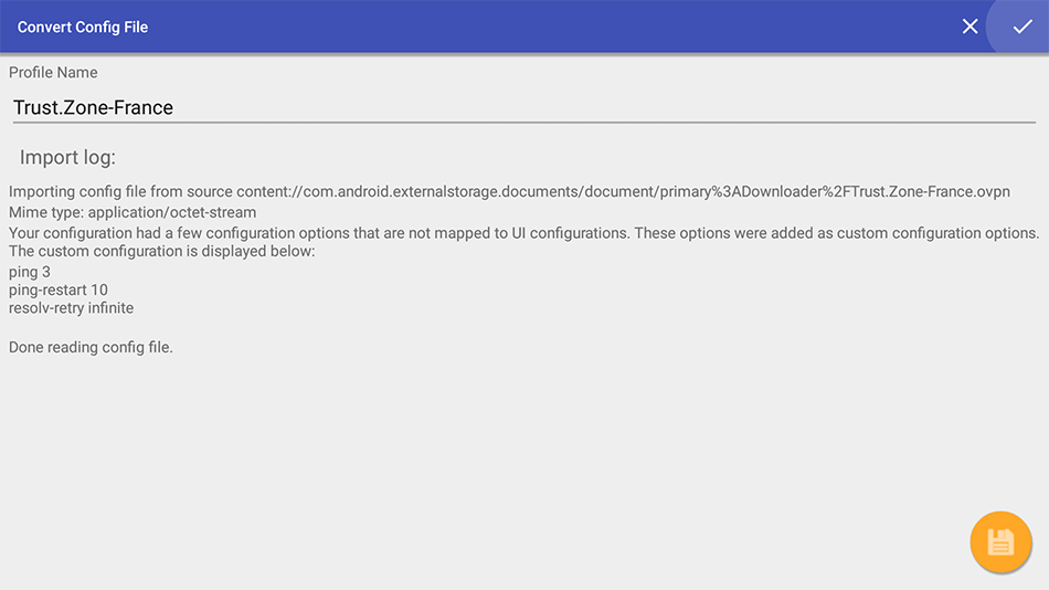 VPN bağlantı profilini uygulamak ve kaydetmek için ekranın sağ üst kısmındaki onay işareti simgesini tıklayın ve tıklayın.