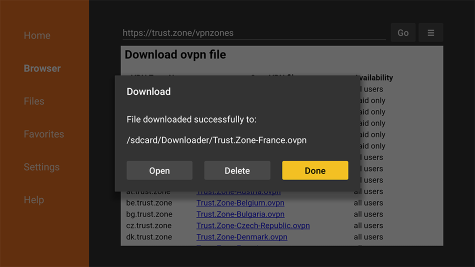 OpenVPN yapılandırma dosyasının (.ovpn dosyası) indirilmesi tamamlandıktan sonra Bitti'ye tıklayın.