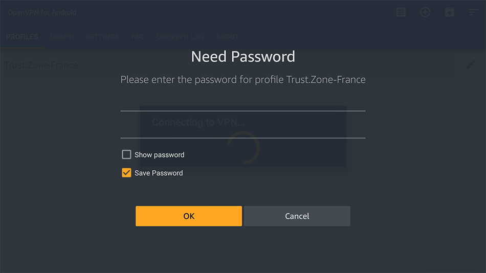 VPN kullanıcı adınızı ve VPN şifrenizi yazın, Şifreyi Kaydet seçeneğini etkinleştirin ve bağlanmak için Tamam'a basın.