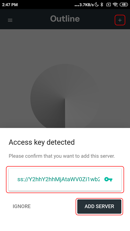 Outline uygulamasını açın, + düğmesine tıklayın ve Erişim anahtarını metin alanına yapıştırın.